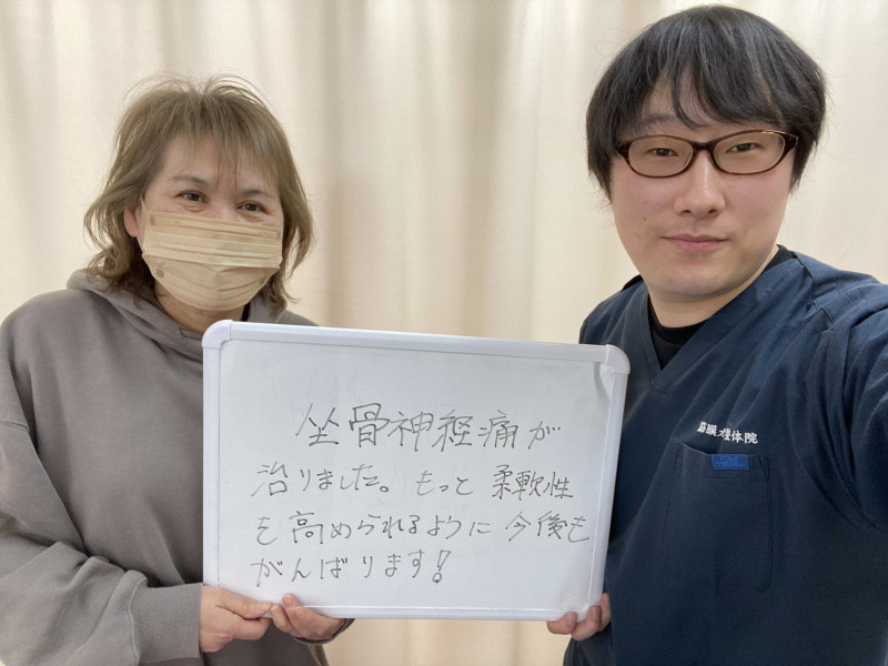 「坐骨神経痛が改善し,車の乗り降りや屈み込みが楽になりました!!」